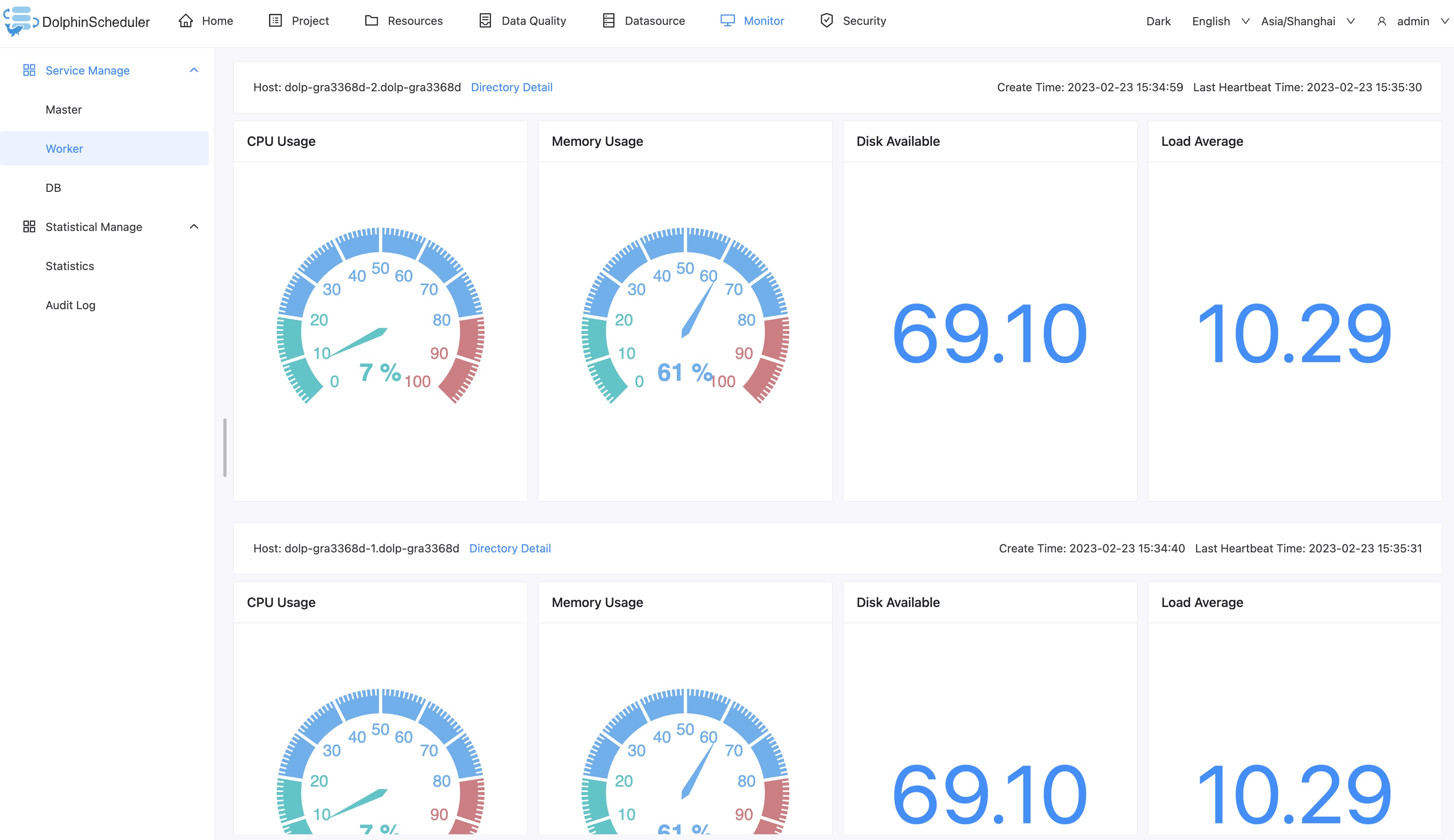 验证 Worker 节点,进入 DolphinScheduler UI -> 监控中心 -> Worker 查看节点信息。