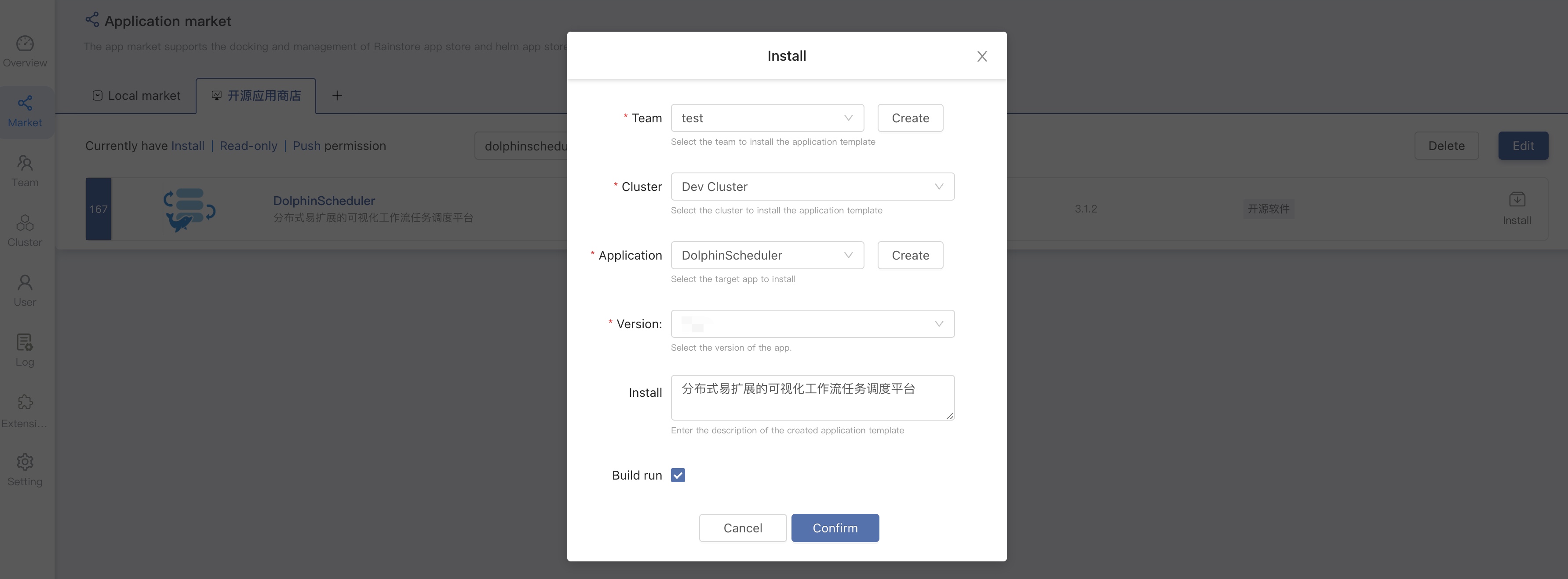 - 进入 Rainbond 的平台管理 -> 应用市场 -> 开源应用商店中搜索 dolphinscheduler 即可找到 DolphinScheduler 应用。