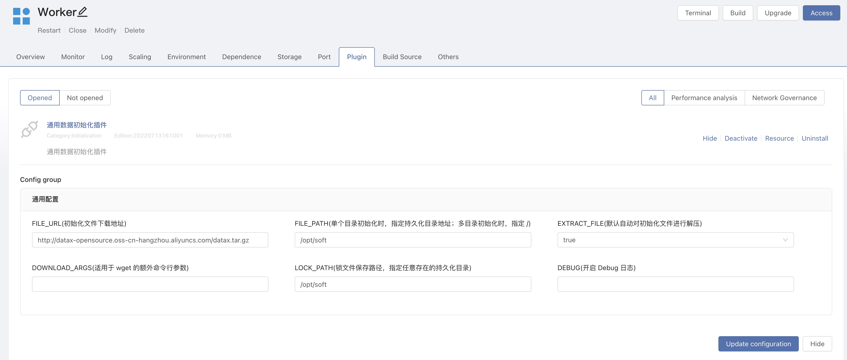 - 开通插件。进入 Worker 组件内 -> 插件 -> 开通 通用数据初始化插件 ,并修改配置