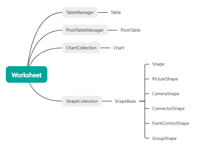 首先,需要确定SpreadJS是否能够获取工作表中的上述元素信息。SpreadJS对上述元素均抽象了独立的管理器,比如TableManager管理Table实例,PivotTableManager管理PivotTable实例,ChartCollection管理Chart实例、ShapeCollection管理Shape实例,如图2所示。由于17.0.0版本优化了图表Chart实现,图表不再是基于DOM元素的浮动对象,而是作为一种形状存在,所以图表Chart实例也可由ShapeCollection管理。以上,便可确定,通过各类型元素的管理器便可获取工作表中对应类型的各元素。