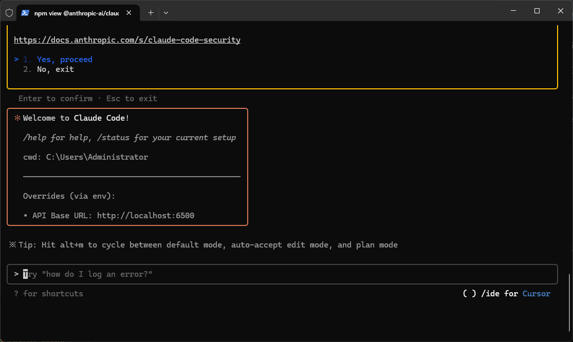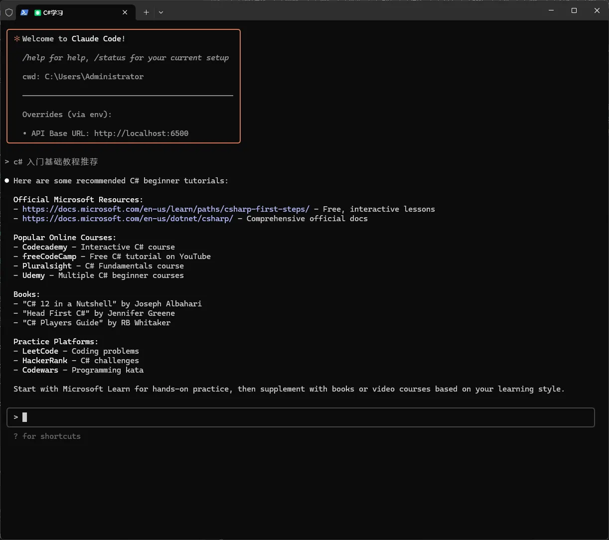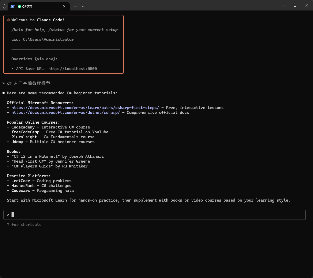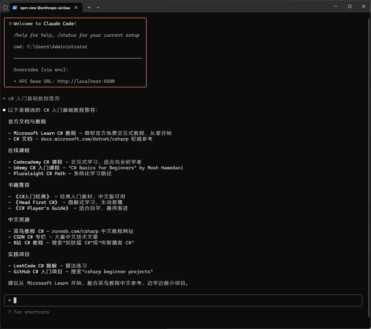 保存配置文件后,打开命令行终端,输入claude命令启动Claude Code: