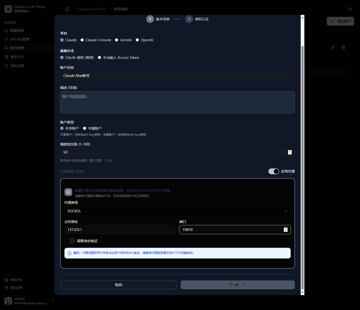 回到账号管理页面,点击"创建账户"。如果您的网络环境需要代理,可以在此处配置代理设置: