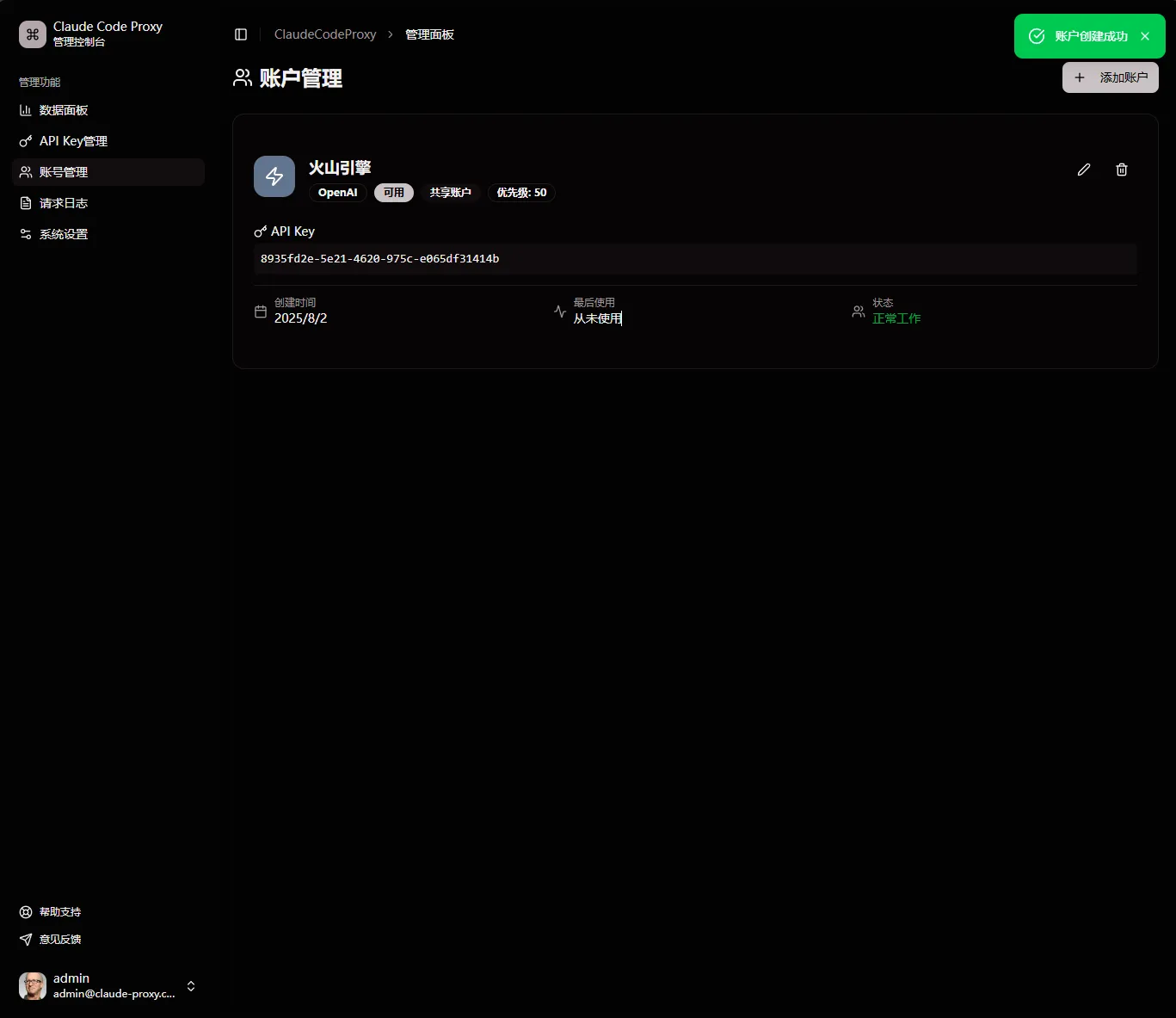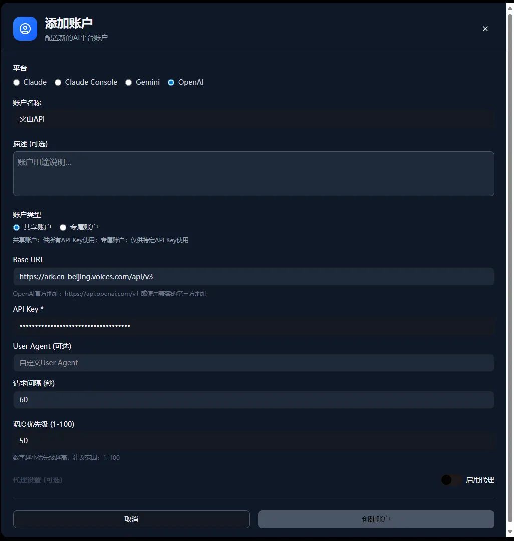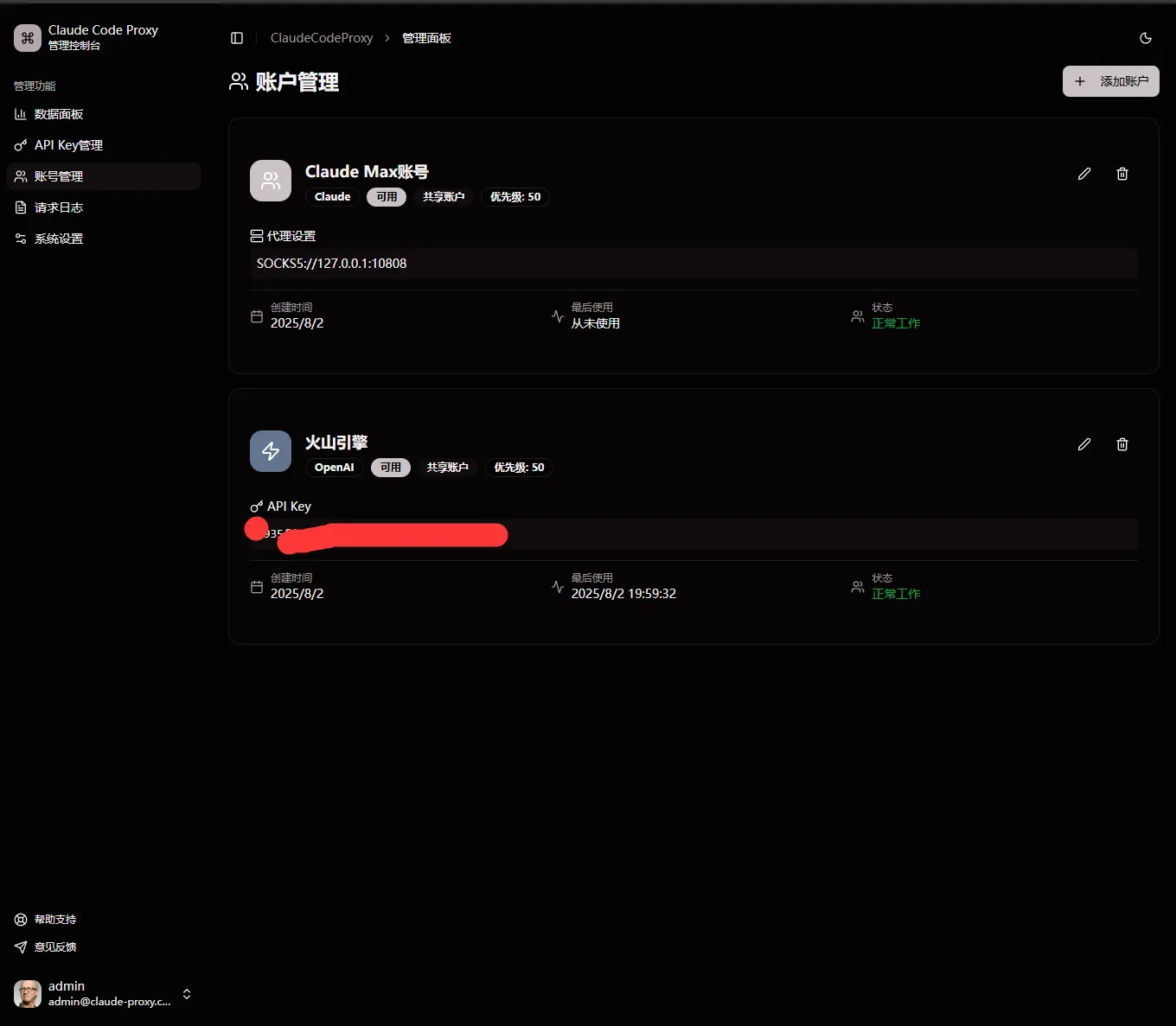 上述步骤已经完成了火山引擎API的接入。如果您还拥有Claude Pro账号,也可以将其接入到代理服务中,这样当Pro账号用量用完后,可以无缝切换到其他模型提供商。