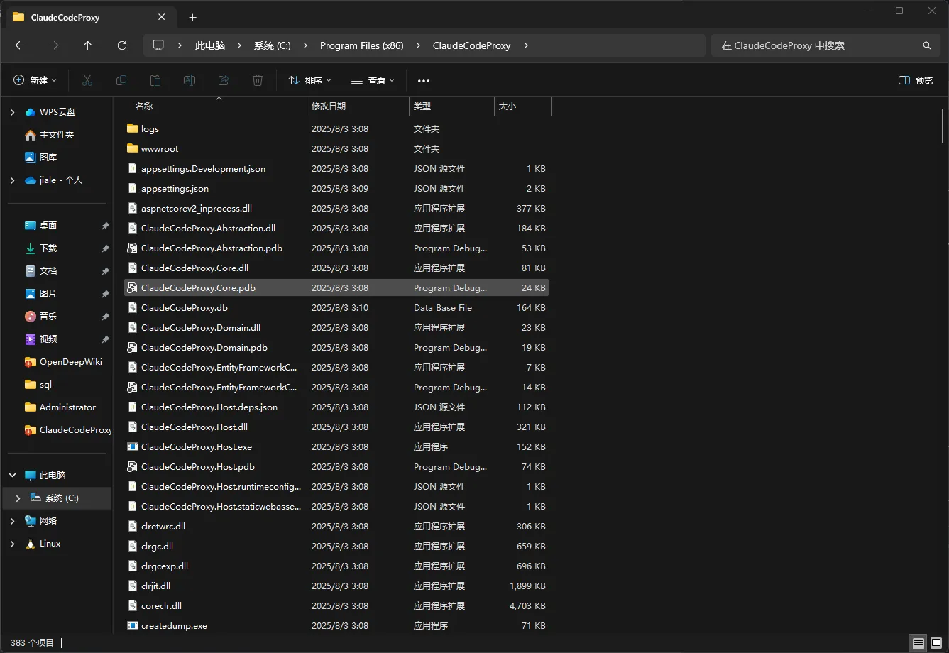 首先访问Releases · AIDotNet/ClaudeCodeProxy页面,下载最新版本的win-64压缩包。下载完成后解压文件,您将看到以下目录结构: