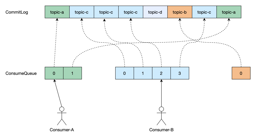从上图中可以看出,尽管消息的写入非常高效,但是消费者需要按照其订阅的 Topic 来从 CommitLog 中读取该 Topic 的消息,显而易见,RocketMQ 需要一种索引机制来快速读取指定 Topic 队列的消息,这正是 ConsumeQueue 要做的事情。