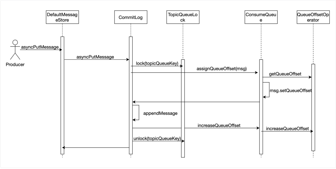 当消息写入到 CommitLog 后,该消息对于消费者是不可见的,只有在 ConsumeQueue 中增加这条消息的 CqUnit 后,消费者才能消费到这条消息,因此写入消息时须立刻往 ConsuemQueue 写入消息的 CqUnit。我们需要给每一条消息指定其在 ConsumeQueue 中的 Offset,QueueOffsetOperator 类维护了一个 Topic 队列与其当前 Offset 的表,当写入一条新消息时,DefaultMessageStore 从 QueueOffsetOperator 中取出该 Topic 队列的当前 Offset,将其写入到消息体中,在消息成功写入到 CommitLog 后,指示 QueueOffsetOperator 更新为当前 Offset + 1。为了防止其他写入线程并发访问 Topic 队列的当前 Offset,在读取和修改 Offset 期间,会使用一个 ReentrantLock 锁定该 Topic 队列。