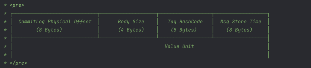 与 CommitLog 类似,ConsumeQueue 使用文件队列来持久化存储消息索引。ConsumeQueue 使用的文件目录所在路径由其对应的 Topic 队列确定,举例说明,一个名为 ABC 的 Topic,其队列0所在的文件目录路径是 /data/rocketmq_data/store/consumequeue/abc/0/。消息的索引对象是固定的20个字节大小,其内部格式定义见下图。