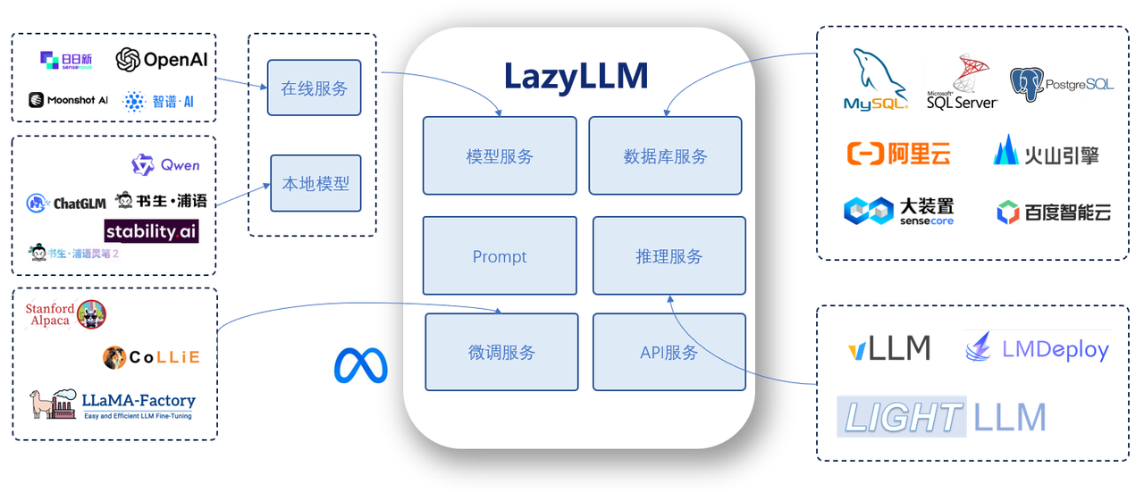 LazyLLM为同一模块的不同技术选型提供了一致的使用体验 -- 统一调用、统一服务、统一部署。