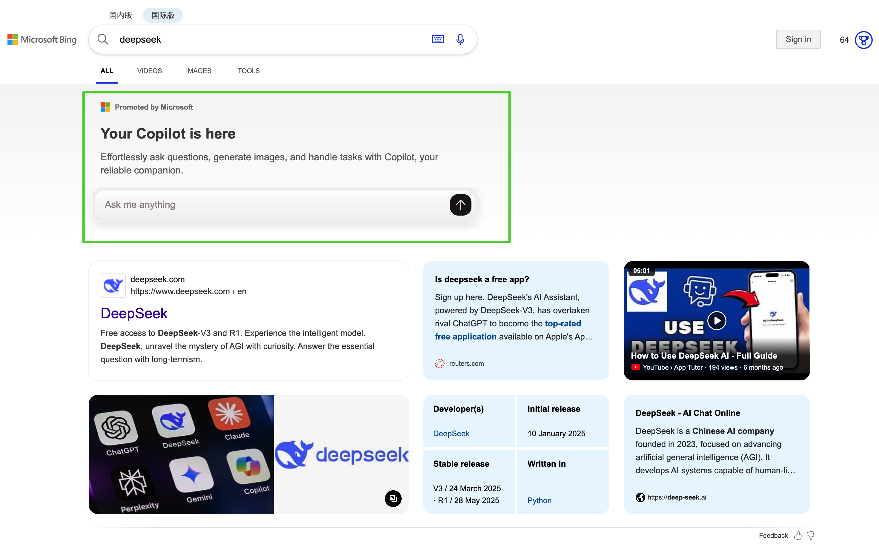 Bing 国际版搜索“DeepSeek”会弹出推广 Copilot 的横幅广告