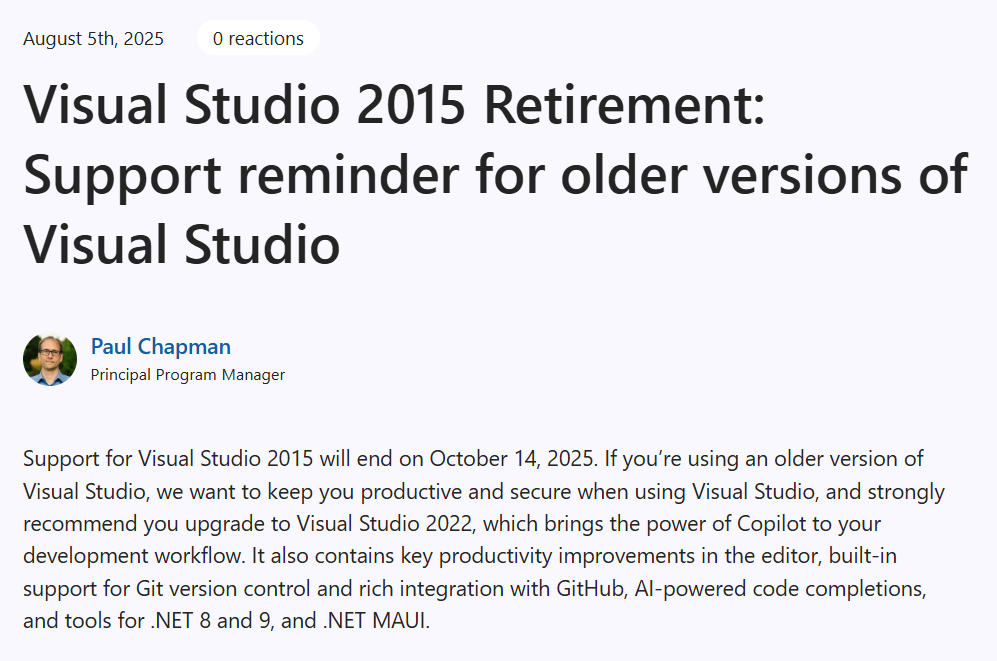 - Visual Studio 2015 扩展支持将于 2025 年 10 月 14 日结束。