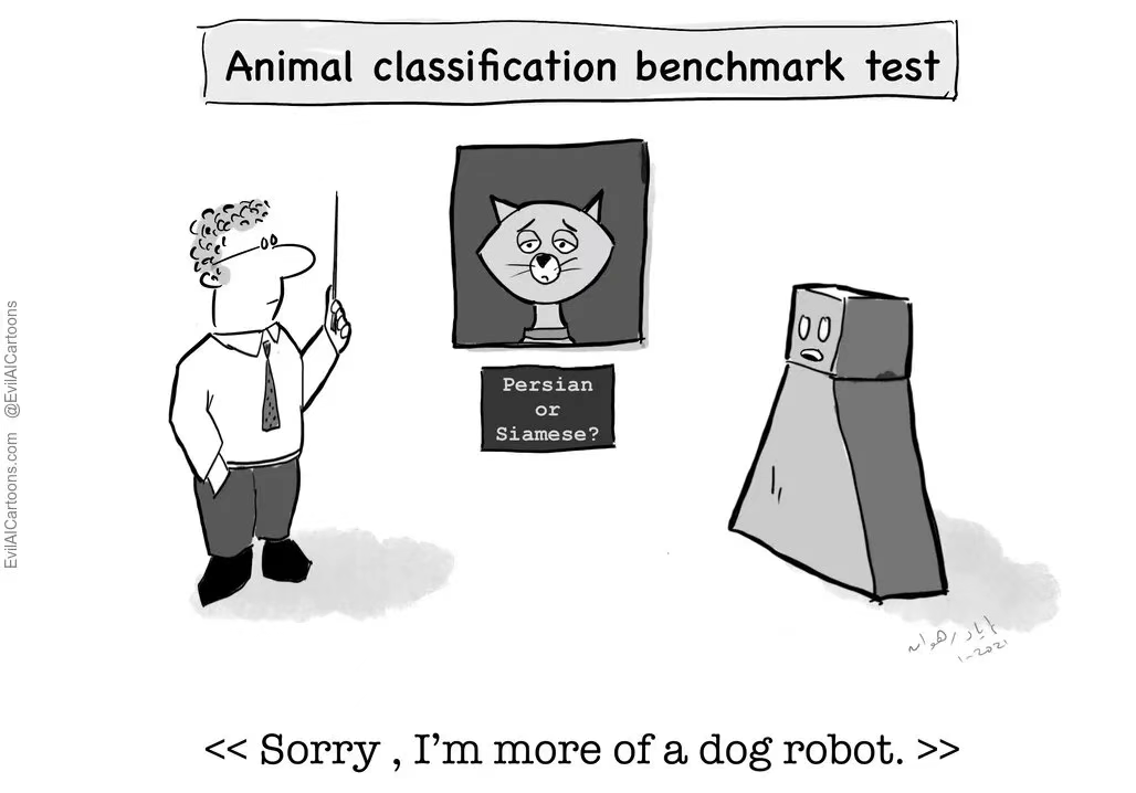 Source[2],这个漫画的笑点在于机器人被要求识别猫的种类,但它却表示自己更擅长识别狗,因此无法完成这个关于猫的分类任务。