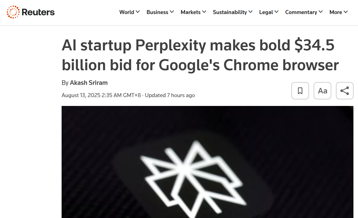 路透社报道称,人工智能初创公司 Perplexity AI 于当地时间周二向 Alphabet 的 Chrome 浏览器发起了 345 亿美元的全现金收购要约,而这一报价远超其自身估值。今年 1 月,该公司还向 TikTok US 发出了类似的收购要约。