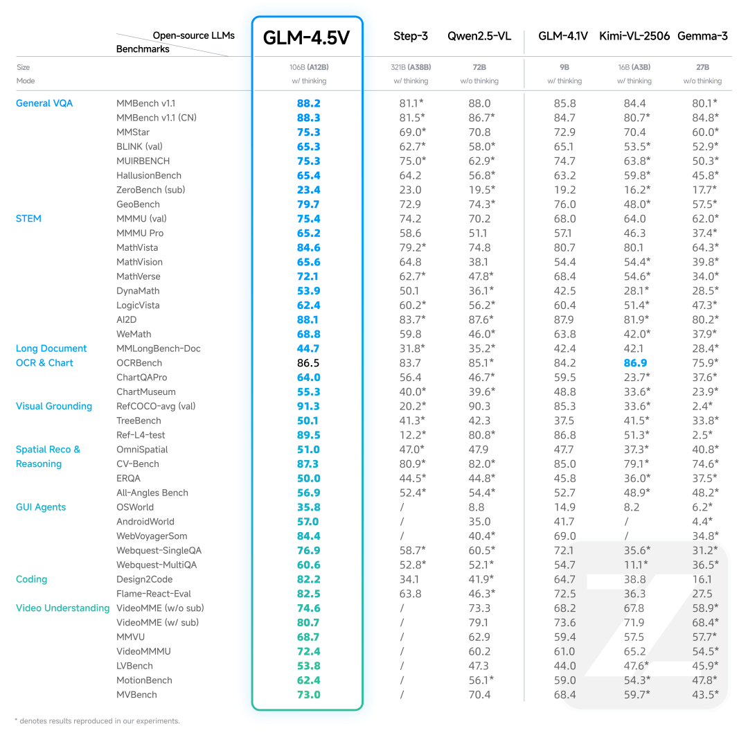 在其基础上,智谱进一步训练出全球100B级效果最佳的开源视觉推理模型——GLM-4.5V,在42个公开视觉多模态榜单中综合效果直接拿下了41个SOTA,涵盖图像、视频、文档理解以及GUI Agent等常见任务。GLM-4.5V聚焦在真实场景下的表现与可用性,实现全场景视觉推理,同时新增“思考模式”开关,用户可灵活选择快速响应或深度推理,平衡效率与效果。