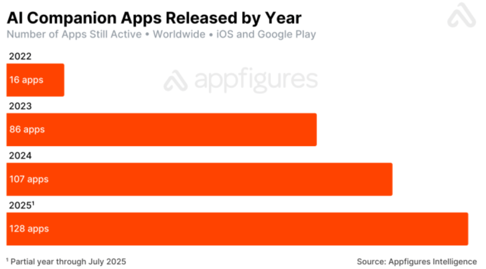AI陪伴应用正在成为移动应用市场的新风口。应用情报公司Appfigures提供的最新数据显示,除ChatGPT和Grok等知名产品外,专门的AI"陪伴"应用需求正在快速增长。在全球337个活跃且有收入的AI陪伴应用中,仅2025年就有128款新应用上线。