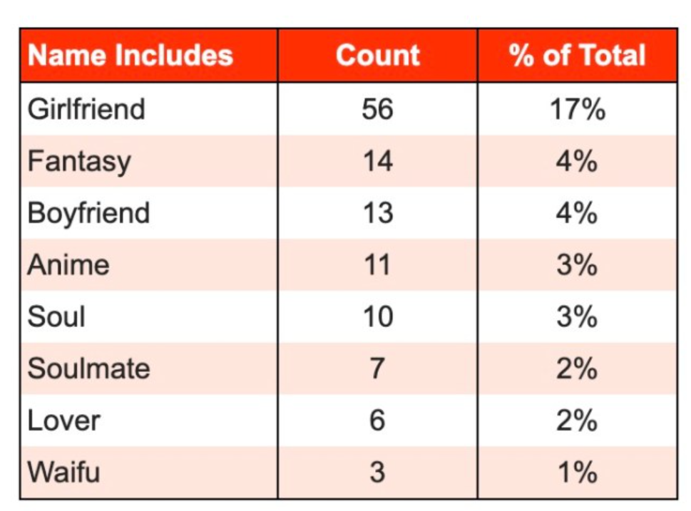 根据Appfigures的数据,最受欢迎的AI陪伴应用是那些面向寻求"AI女友"用户的产品。在当前市场上的活跃应用中,17%的应用名称包含"女友"一词,相比之下,只有4%的应用名称包含"男友"或"幻想"。动漫、灵魂伴侣、恋人等词汇的提及频率则相对较低。