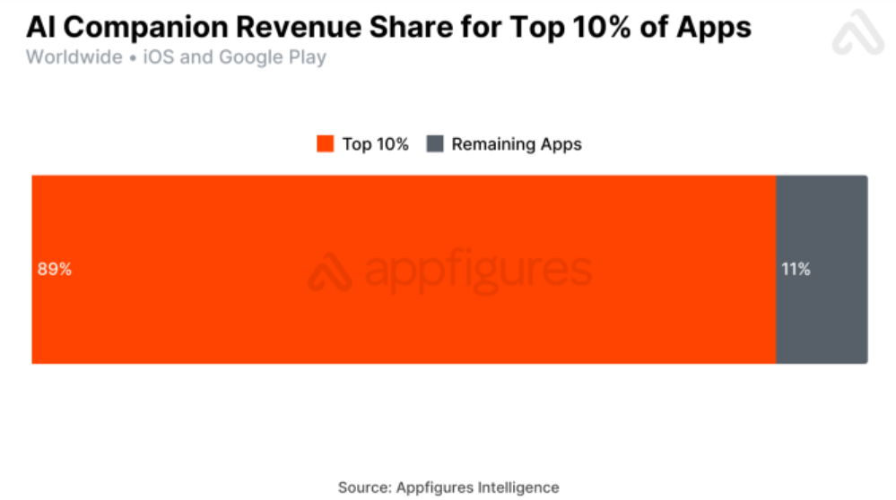 数据显示,收入分配呈现明显的头部效应:排名前10%的AI陪伴应用占据了该类别89%的收入。此外,约10%(33款)的应用终身消费者支出已超过100万美元。