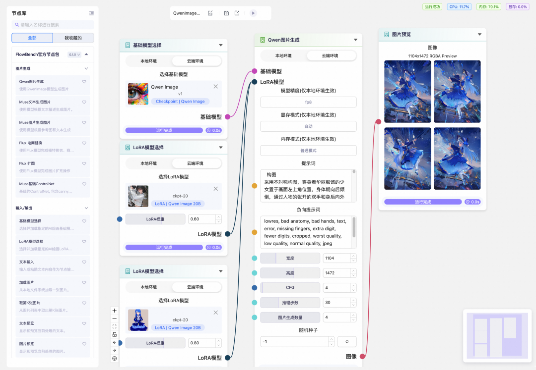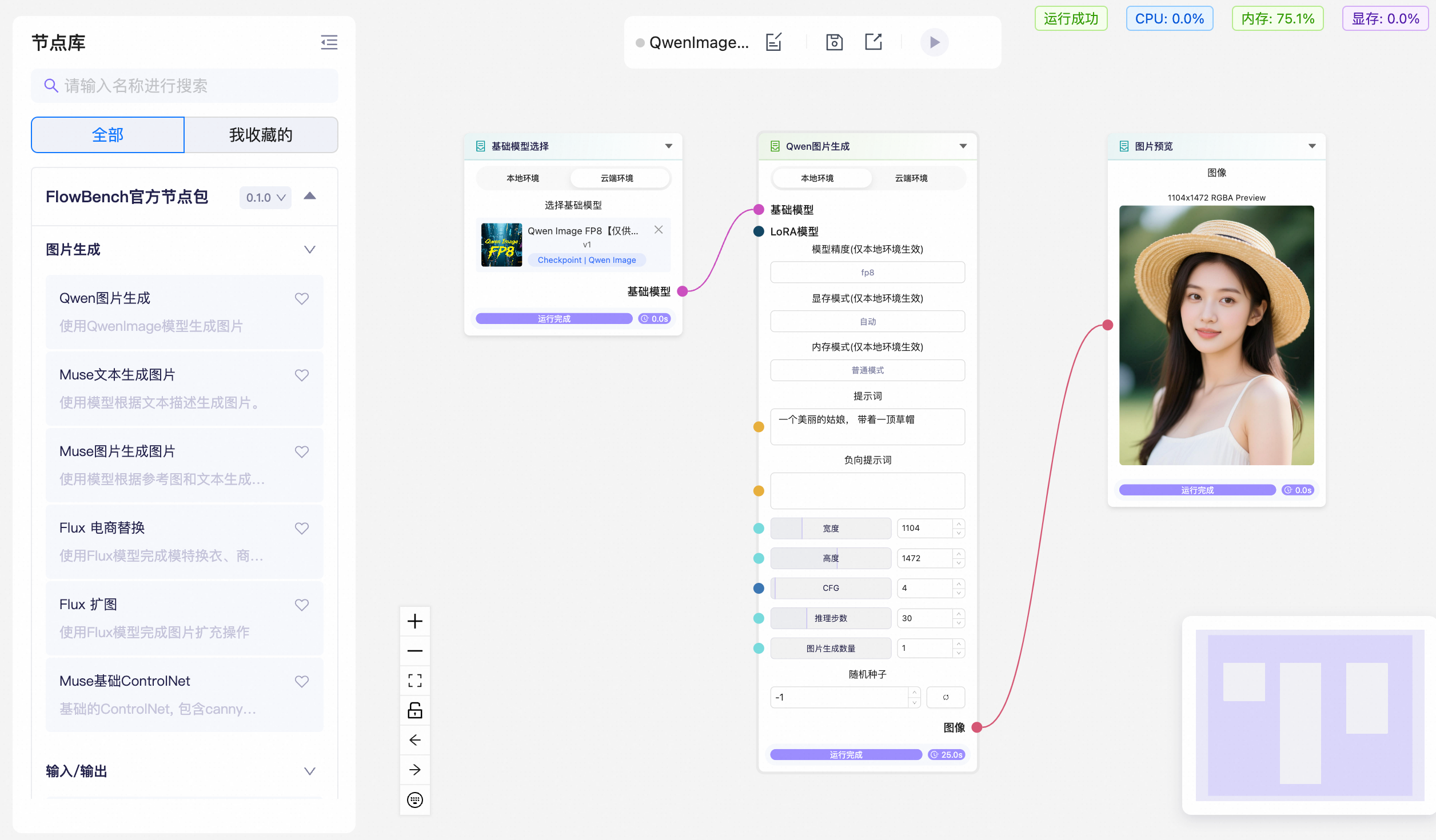 FlowBench 是以工作流位核心的一站式 AI 工作流创作平台,支持本地与云端资源协同运行,面向开发者、设计师及 AI 创作者提供高效、稳定、易用的可视化工作流体验。现已全面开放下载公测,原生支持 QwenImage,实现 8G 显存的生图,更支持本地与云端环境自由切换、多 LoRA 融合、多图批量生成等复杂数组能力的操作。
