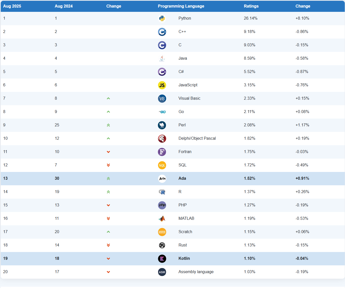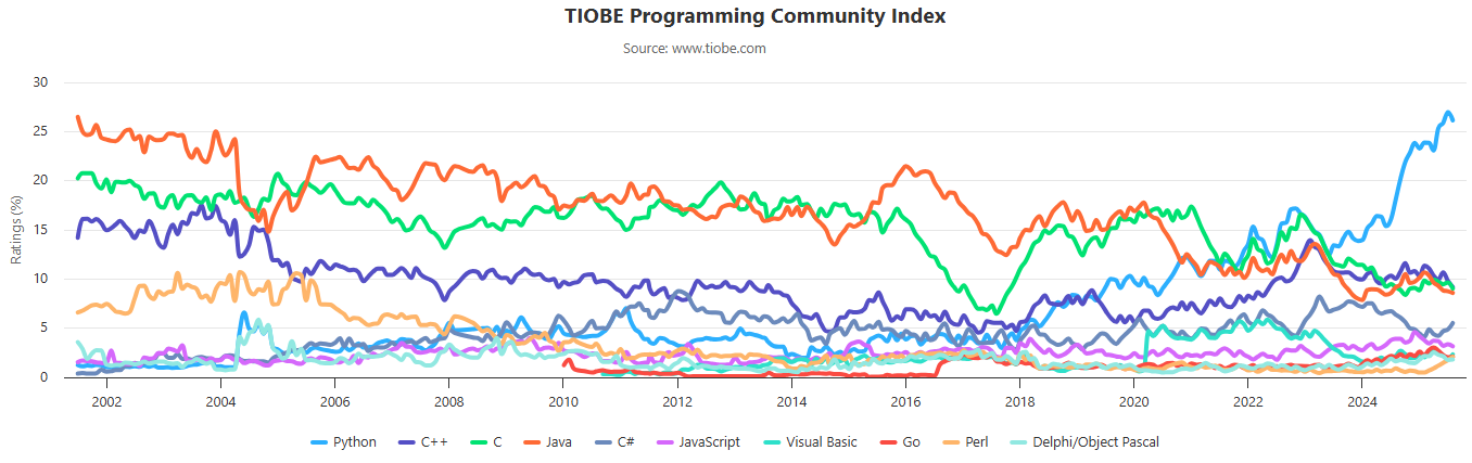 TIOBE 公布了 2025 年 8 月的编程语言排行榜。