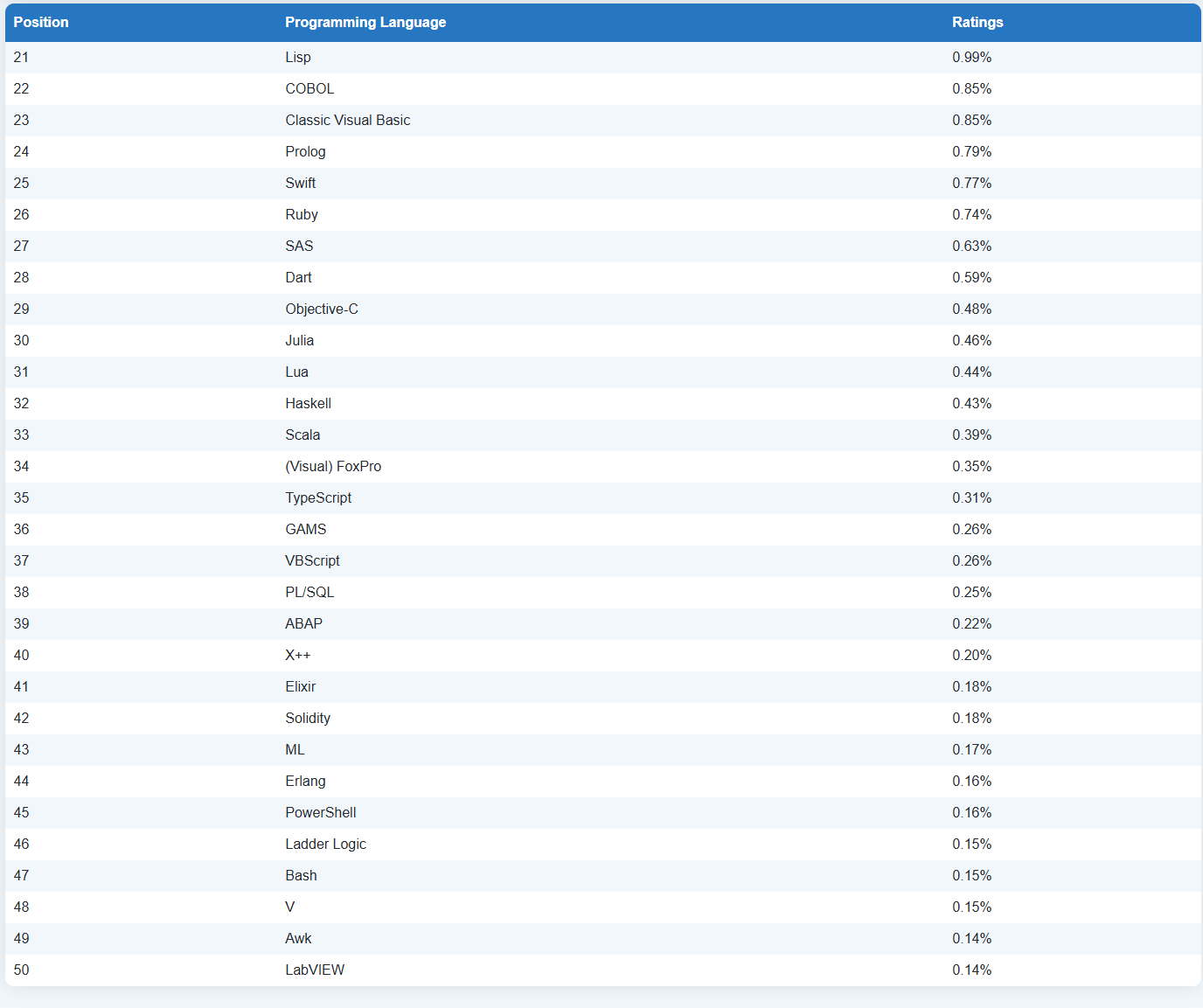 ActionScript, Algol, Alice, Apex, B4X, Clojure, Crystal, Curl, D, Elm, F#, Forth, Groovy, Hack, Icon, Inform, Io, J, JScript, Logo, Modula-2, Mojo, MQL5, NATURAL, Nim, Oberon, OCaml, Occam, OpenCL, PL/I, Q, Racket, Raku, REXX, Ring, RPG, S, Scheme, Simulink, Smalltalk, SPARK, Stata, SystemVerilog, Tcl, Transact-SQL, Vala/Genie, VHDL, Wolfram, Xojo, Zig