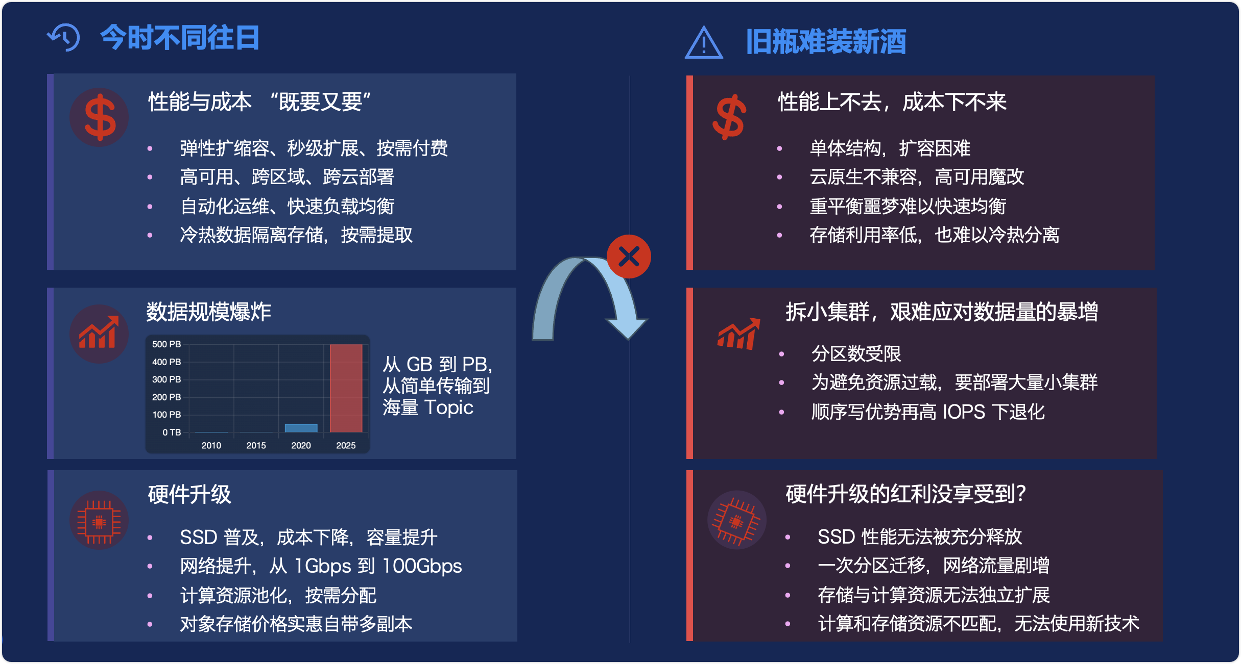 - 同时,旧瓶难装新酒的问题日益突出:单体架构的性能上不去,成本下不来——扩容困难,云原生不兼容,重平台重构建成本巨大,存储利用率低,也难以分散。更为关键的是,折小集群,艰难应对数据量的暴增——分区数受限,为跟得上资源过载,要部署大量小集群,间序与优先级高度IOPS下退化。