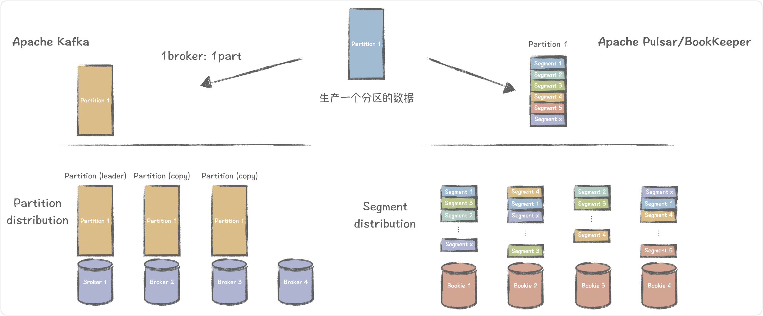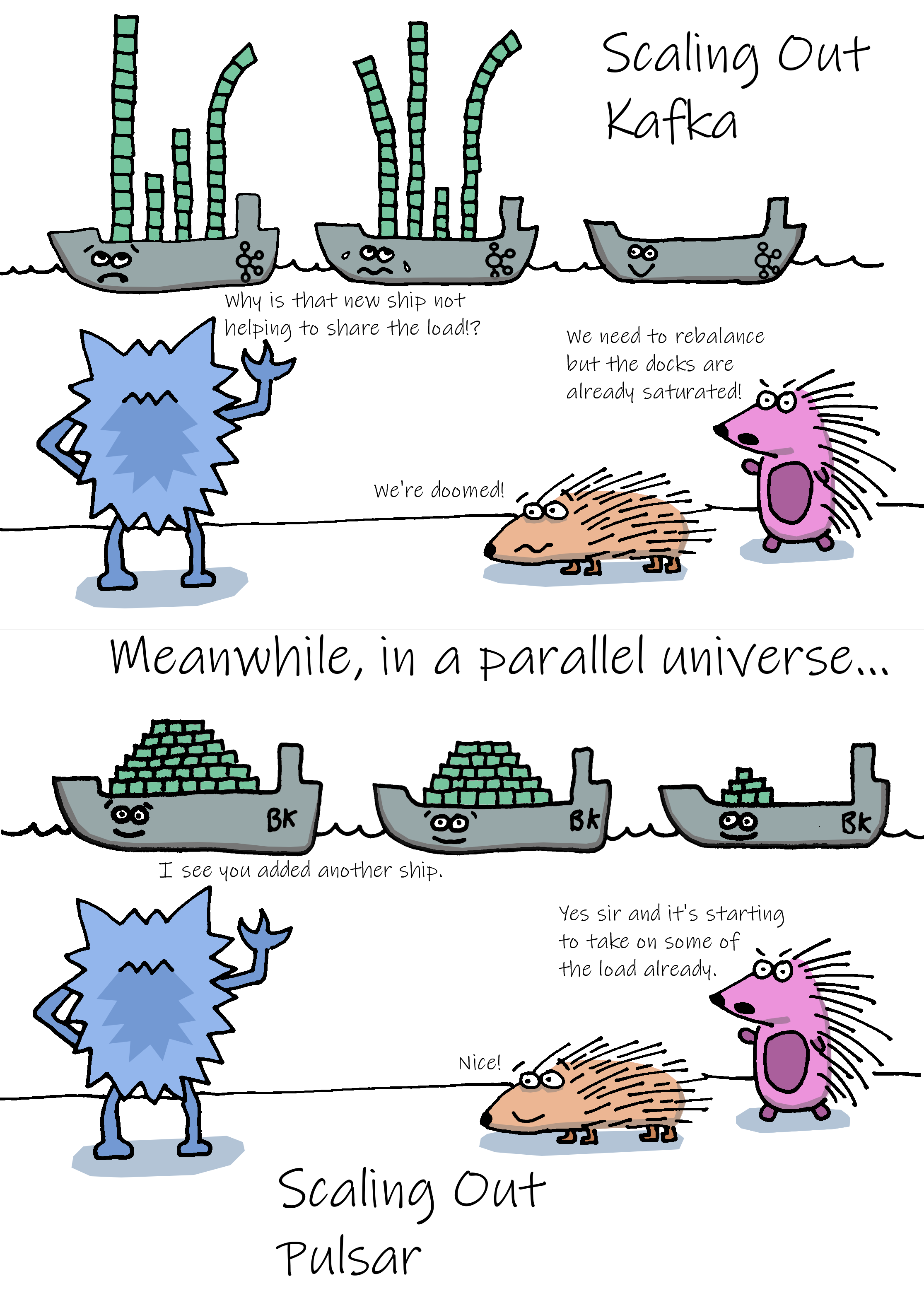 最后,在今天,再拿出中间件大师Jack Vanlightly 的传奇手绘《Kafka vs Pulsar - Rebalancing (Sketch)》,大家是不是更都有答案啦。