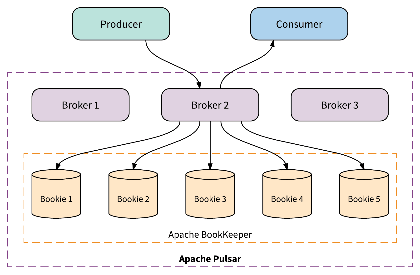 上图示意了一个 Pulsar 集群的存算分离架构。多个 Broker 节点处理生产者和消费者请求,而 Apache ZooKeeper(或 etcd)则负责元数据管理,所有消息持久化到 BookKeeper 的多个 Bookie 中。