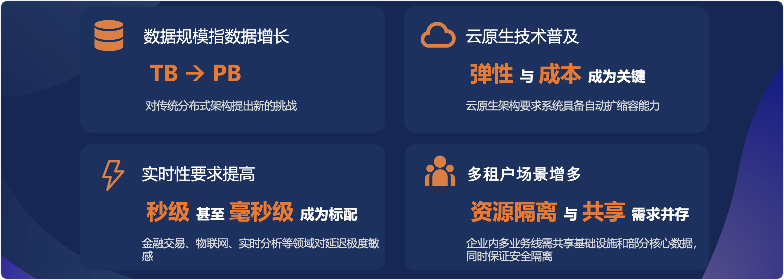 - 性能与成本的“鱼与熊掌”之争变得更加尖锐——弹性扩容、秒级扩容、按需付费、高可用、跨区域、跨部门、自动化运维、快速故障切换、冷热数据分离、按需提取等需求并存,而传统单体架构在这些方面都显得力不从心。