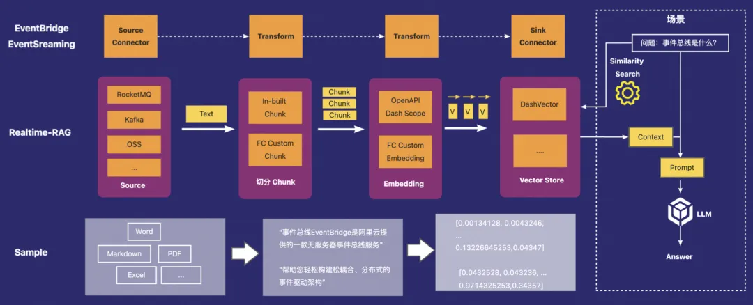 我们需要把存在上游 OSS 的 EventBridge 文档,通过 EventBridge 的事件流,进行 Chunk 切分、Embedding 向量化,然后存储到向量数据库;