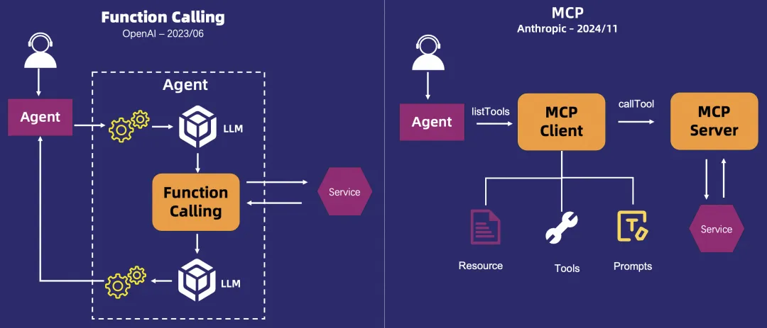 首先,我们看下 Agent 和传统 Service 之间的通信。目前有两种主流的方式:Function Calling和MCP。