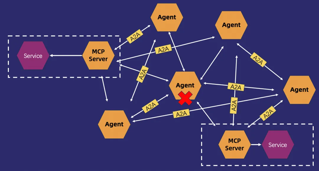 - 其次,网状的连接,一旦某一个 Agent 出现问题,hang 住了某些资源,会不会拖垮其他 Agent 的服务?甚至拖垮整个系统?这类问题在微服务中,再常见不过了。