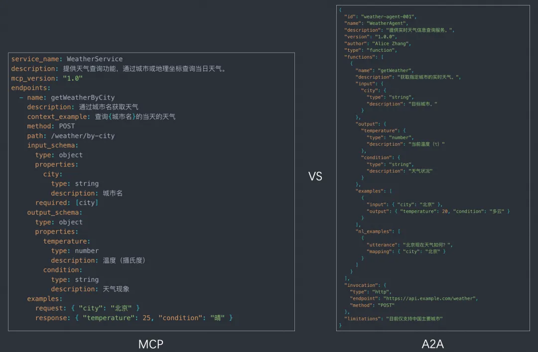 A2A 和 MCP的职责,设想很完美,但是实际运行的时候会遇到很多挑战。我们先来一起看看在 MCP 和 A2A 协议下,两者用来声明一个 Agent 或者 Service 能力的时候是怎么样的?