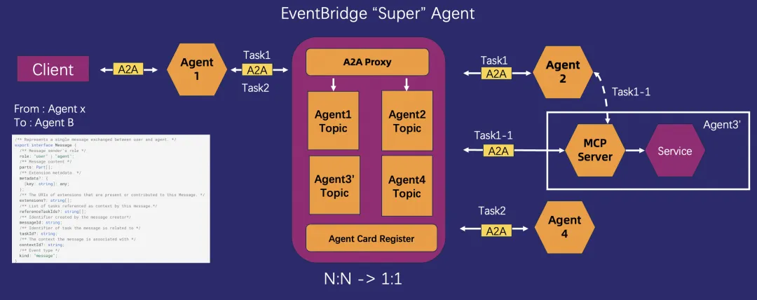 - 除此之外,"Super" Agent 中的 Proxy 除了 A2A 协议,还会路由和跟踪每一个 Task 的运行状态,即使在异常/重启/集群扩容等场景下,每一个 Task 都能被按预期处理,并把状态同步回 Agent。