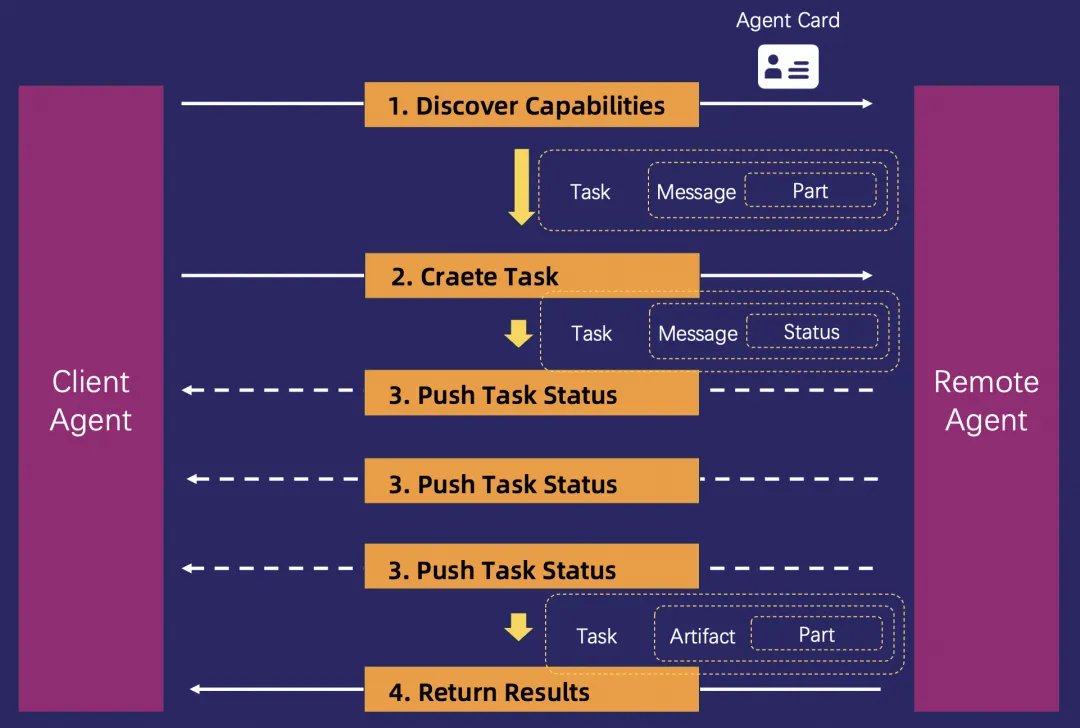 Google 在今年 4 月份的时候,提出了一个 A2A 的通讯协议,其核心运行机制分为四步: