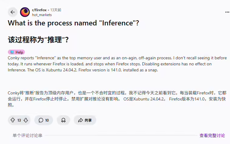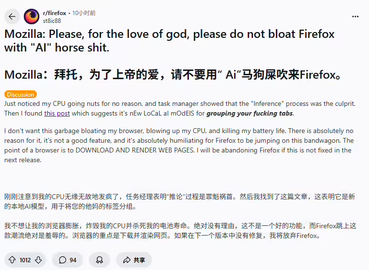 用户批评 Mozilla 盲目跟风,将浏览器变成了 "AI 游乐场",违背了浏览器本应简单高效的原则。 此外,用户发现无法直接终止 "Inference" 进程,否则会导致 Firefox 崩溃并重启。