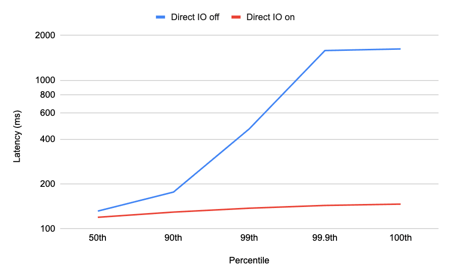 在低内存场景下,direct IO 对搜索延迟的改善非常显著(注意这里是对数刻度):
