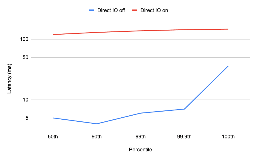 如你所见,当向量数据大到超过 RAM 容量时开启 direct IO 可以显著降低 kNN 向量搜索的高延迟。但当内存足够时开启 direct IO 会导致性能大幅下降。