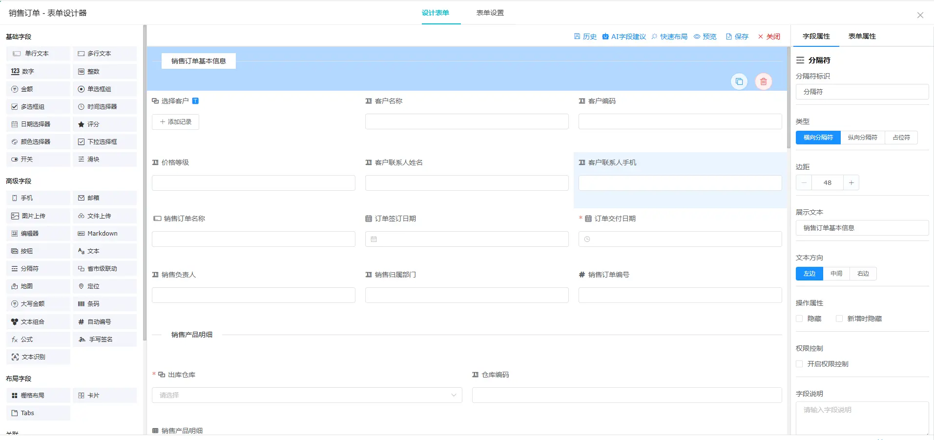 - 8. 表单设计器支持复杂控件,关联记录: 在表单中与其他表单有关联时可以使用关联记录;子表,用于主表中录入多条子表信息;栅格布局: 将一行一列的字段转换成一行多列显示,满足更多的需求;