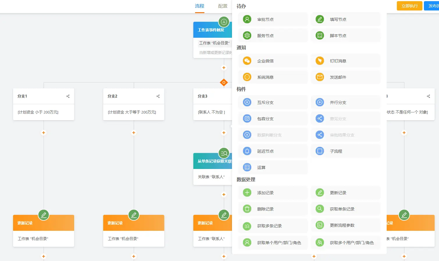 - 平台内的自动化工作流还可以实现审批、填写等控制流程和业务自动化。