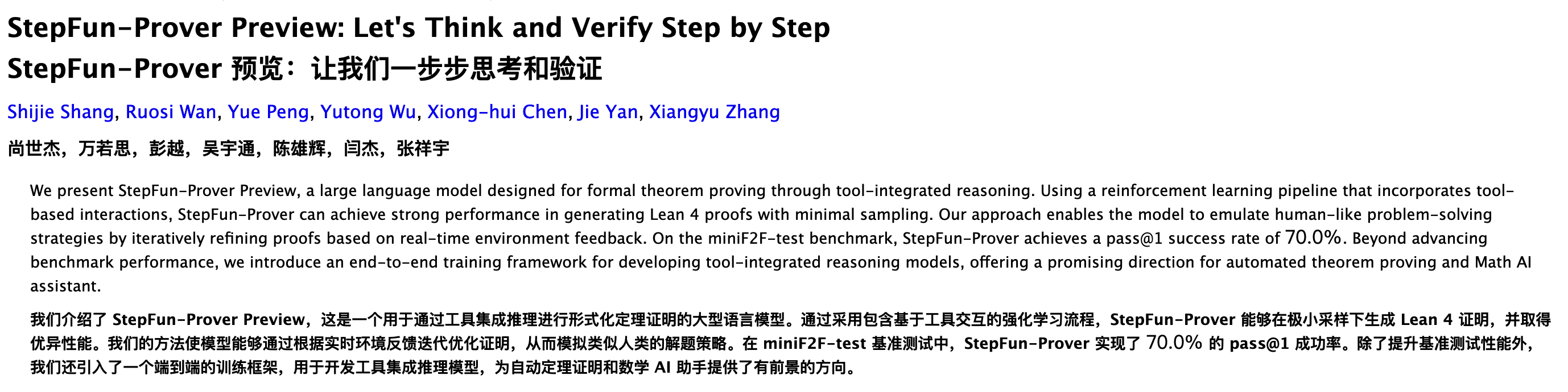 阶跃星辰(StepFun)发布了 StepFun-Prover-Preview 系列模型,包括 7B 和 32B 两个版本,专门用于形式化定理证明(formal theorem proving)。