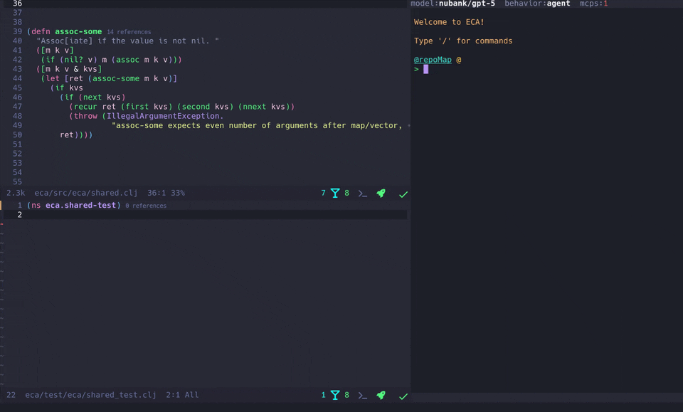 Editor Code Assistant (ECA) - 人工智能结对编程功能,不受编辑器限制。旨在轻松连接 LLM 和编辑器,并通过定义明确的协议为 AI 结对编程提供最佳的用户体验。服务器采用 Clojure 编写,并深受 LSP 协议的启发,LSP 协议是此类集成的一个成功案例。