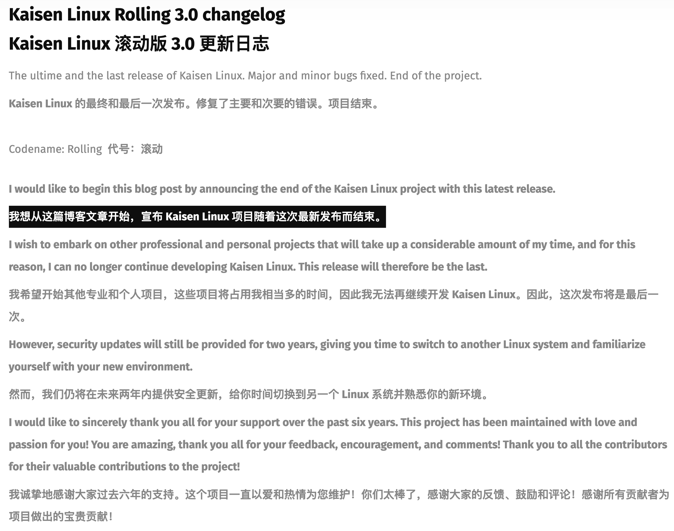 在 Rolling 3.0 版本的发布中,Chevreuil 提到,由于新的个人和职业项目占据了大量时间,他无法继续开发 Kaisen Linux,这个版本将成为项目的绝唱。