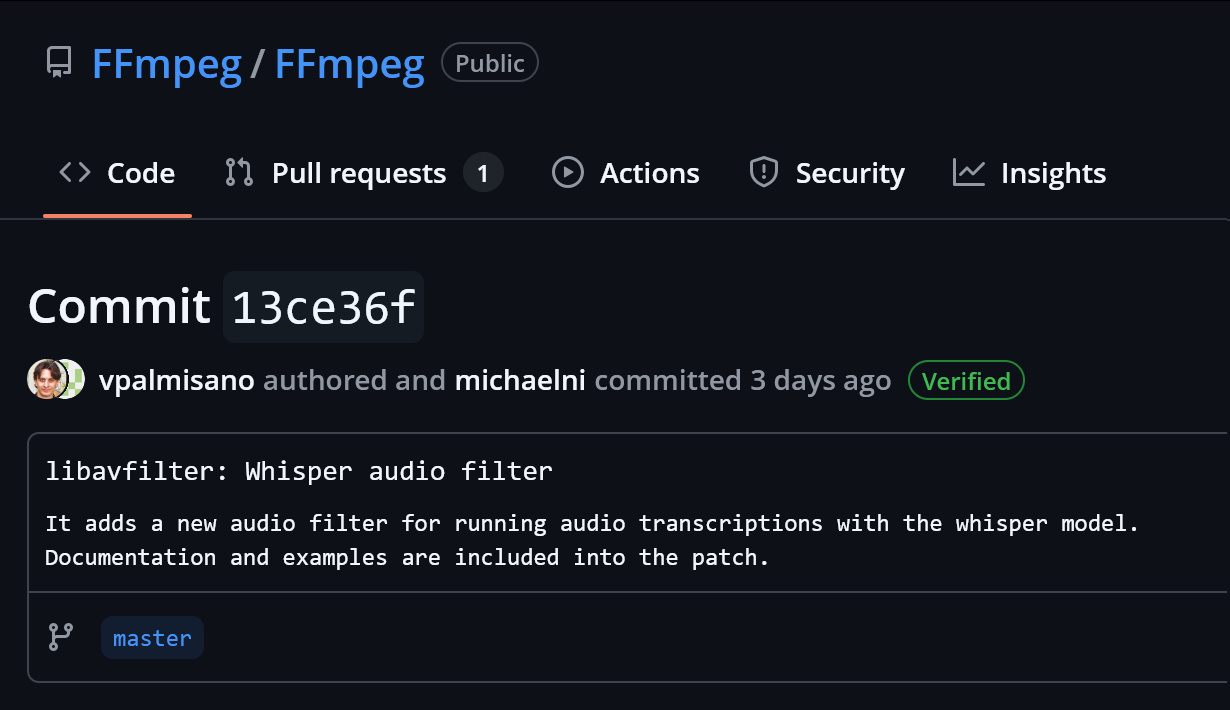 开源多媒体框架 FFmpeg 集成 Whisper.cpp,增加 AI 语音转写功能