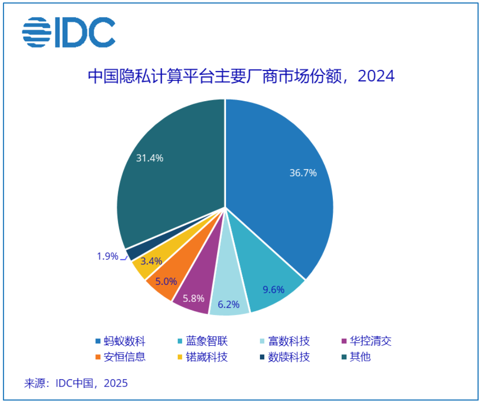 国际数据公司IDC发布了《中国隐私计算平台主要厂商市场份额,2024》,报告显示,2024年,中国隐私计算市场规模达到9.8亿元,同比增长10.1%。其中,蚂蚁数科以36.7%的市场占有率位居首位,这也是蚂蚁数科连续第三年位居中国隐私计算市场份额第一。