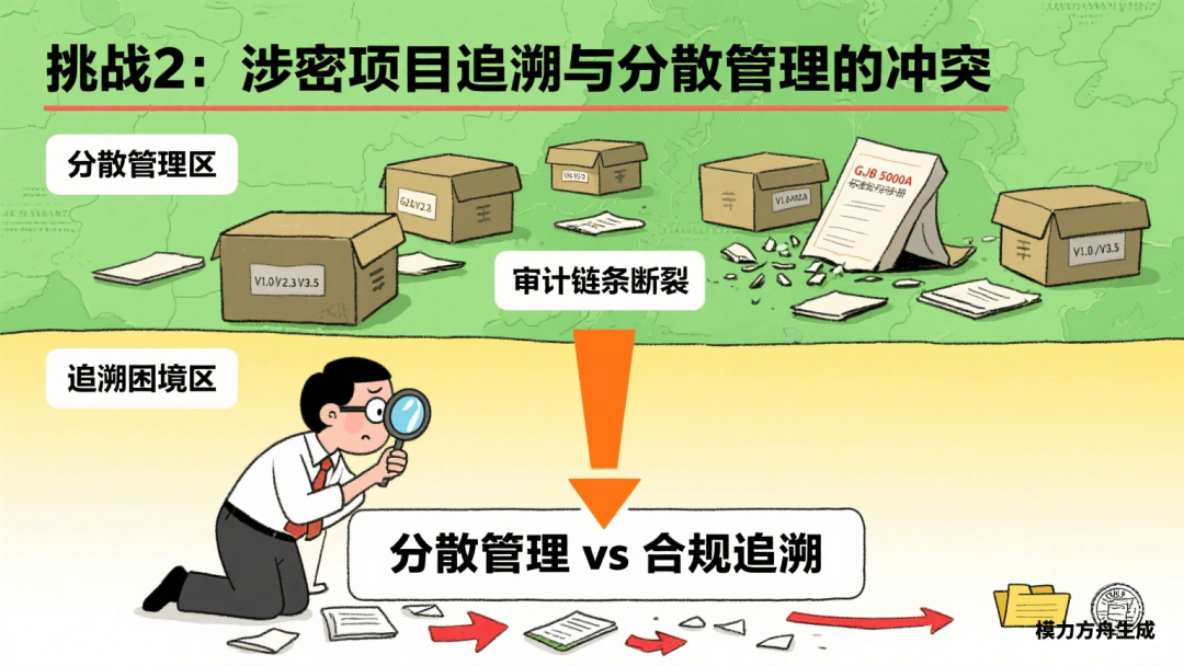 在装备研制的涉密场景中,涉密项目追溯与分散管理的冲突集中体现在「合规-效率」的双重矛盾上。从合规角度而言,明确规定了「配置项变更控制」要求,强调装备研制需满足全生命周期可追溯性,确保「一物一码、全程留痕」。