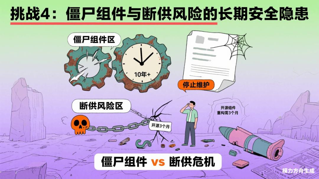 军工装备具有「长生命周期」 特性,其服役周期往往长达数十年,而组件的开发与维护周期通常较短,这种特性使得组件管理面临严峻挑战。其中,「僵尸组件」作为永久性风险点,对装备的长期安全运行构成显著威胁。此类组件通常因开发团队解散、技术支持终止等原因,在装备服役期间逐渐失去维护能力,一旦暴露安全漏洞,将因缺乏持续更新机制而无法修复。