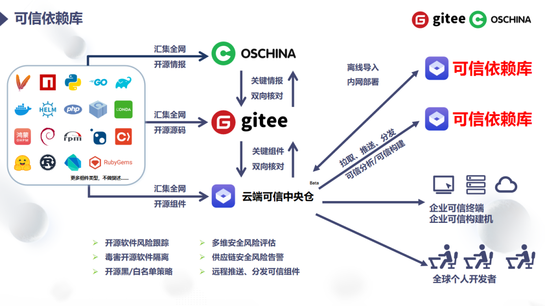 该理念指导下的架构以 Gitee 可信依赖库构建的军工专属「三位一体」 解决方案为基础,采用分层设计方法,将技术特性与军工场景需求紧密结合,覆盖「环境-制品-管控」全链条,形成主动防御能力以保障制品管理的安全可控与自主可靠。