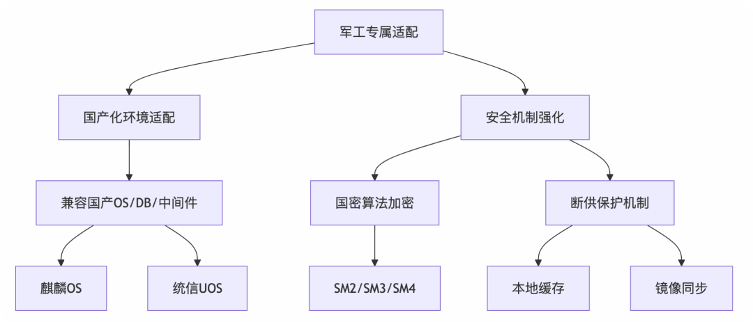 「军工专属」设计是该架构区别于民用方案的核心特征,主要体现在国产化环境适配与安全机制强化两方面。