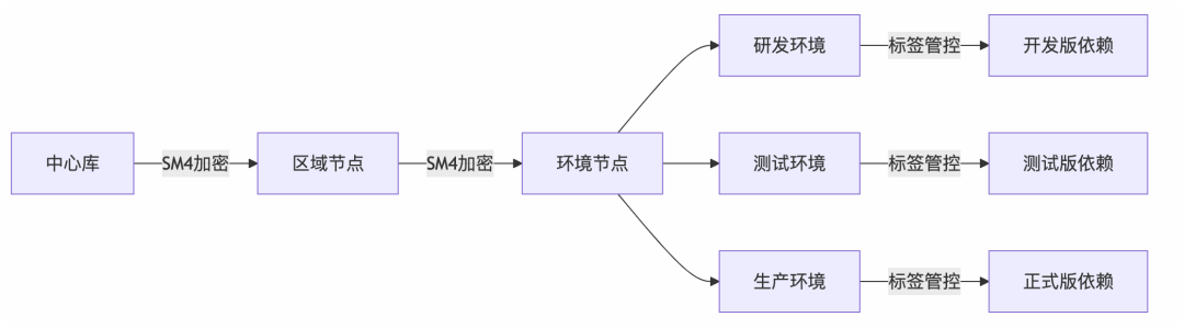 针对环境隔离与版本精准管控需求,方案设计「中心库→区域节点→环境节点」 三级分级分发网络,并结合环境标签强制管控机制。其中,中心库作为核心枢纽存储全量依赖资源,区域节点承担跨区域分发与缓存职能,环境节点则直接服务于具体研发或生产环境。通过标签化管控,研发环境仅允许存储和使用开发版依赖,生产环境则严格限定接收「测试通过+审批完成」的正式版本,从源头避免因版本混用导致的环境不一致问题。