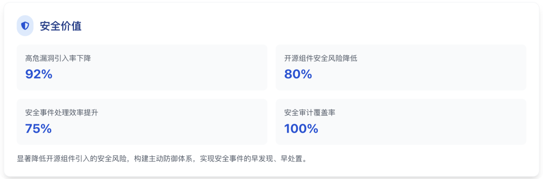 显著降低开源组件引入的安全风险,高危漏洞引入率下降92%,开源组件整体安全风险降低80%以上,符合相关标准要求。通过阻断高危漏洞传播路径,有效减少单次故障造成的损失超千万元,形成了对装备软件供应链安全的系统性风险管控能力。