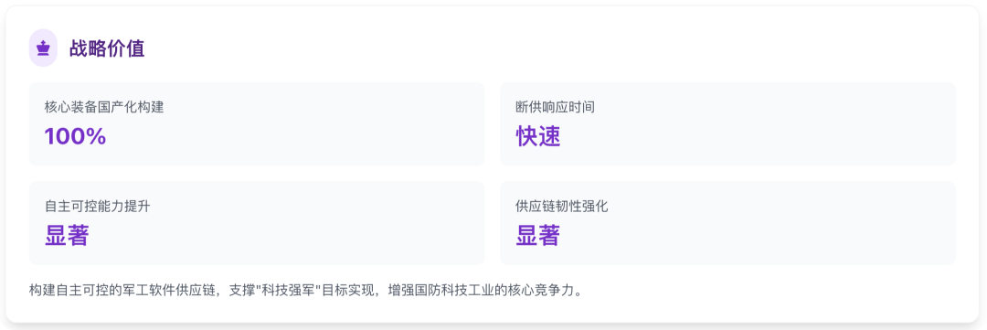 通过构建自主可控的军工软件供应链,支撑了「科技强军」目标的实现。某军工集团已实现核心装备软件 100% 国产化组件构建,彻底摆脱对国外开源生态的依赖,增强了国防科技工业的核心竞争力,为军工领域软件供应链的自主可控发展奠定了基础。